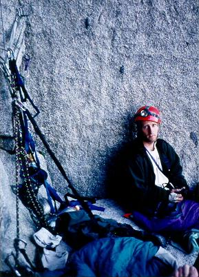 The hauling is tremendously hard. I can only move the bag by pulling up on the line with one hand while applying full body weight to the other side of the pulley. Dennis repeatedly goes down to free the bag and then returns to help haul. After finishing the free blast around 3pm it isn't till 2:30am that we are back in our sleeping bags on heart ledges. Not optimal planning...