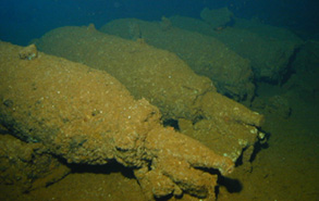 | Quad 21-inch torpedoes on the USS Lamson at the bottom of Bikini Atoll. |